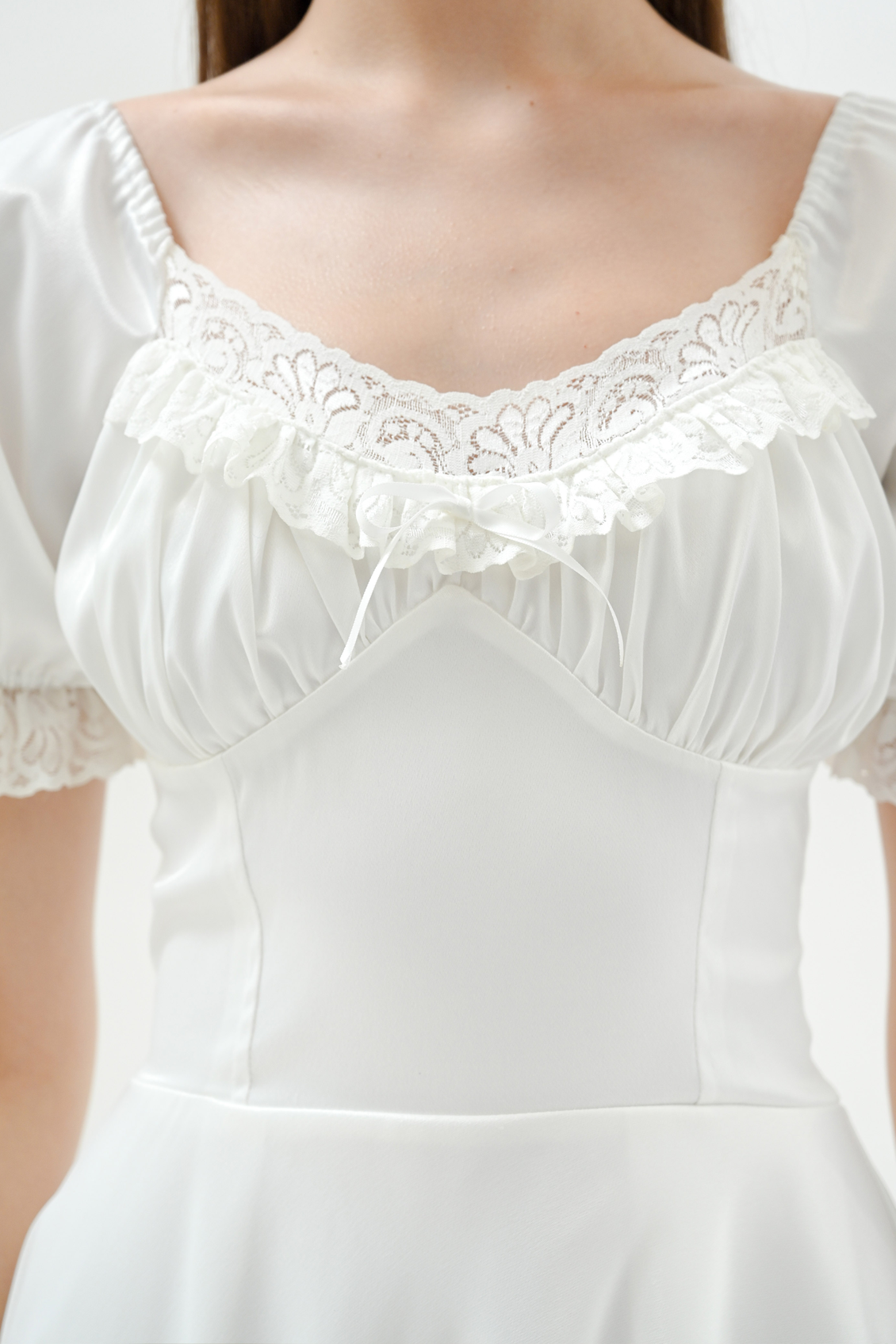 The Anya dress is made out of our soft satin. The dress features a sweetheart neckline, puff sleeves, and a circle skirt. The back features an invisible zip in the middle. This dress is not lined and runs true to size.