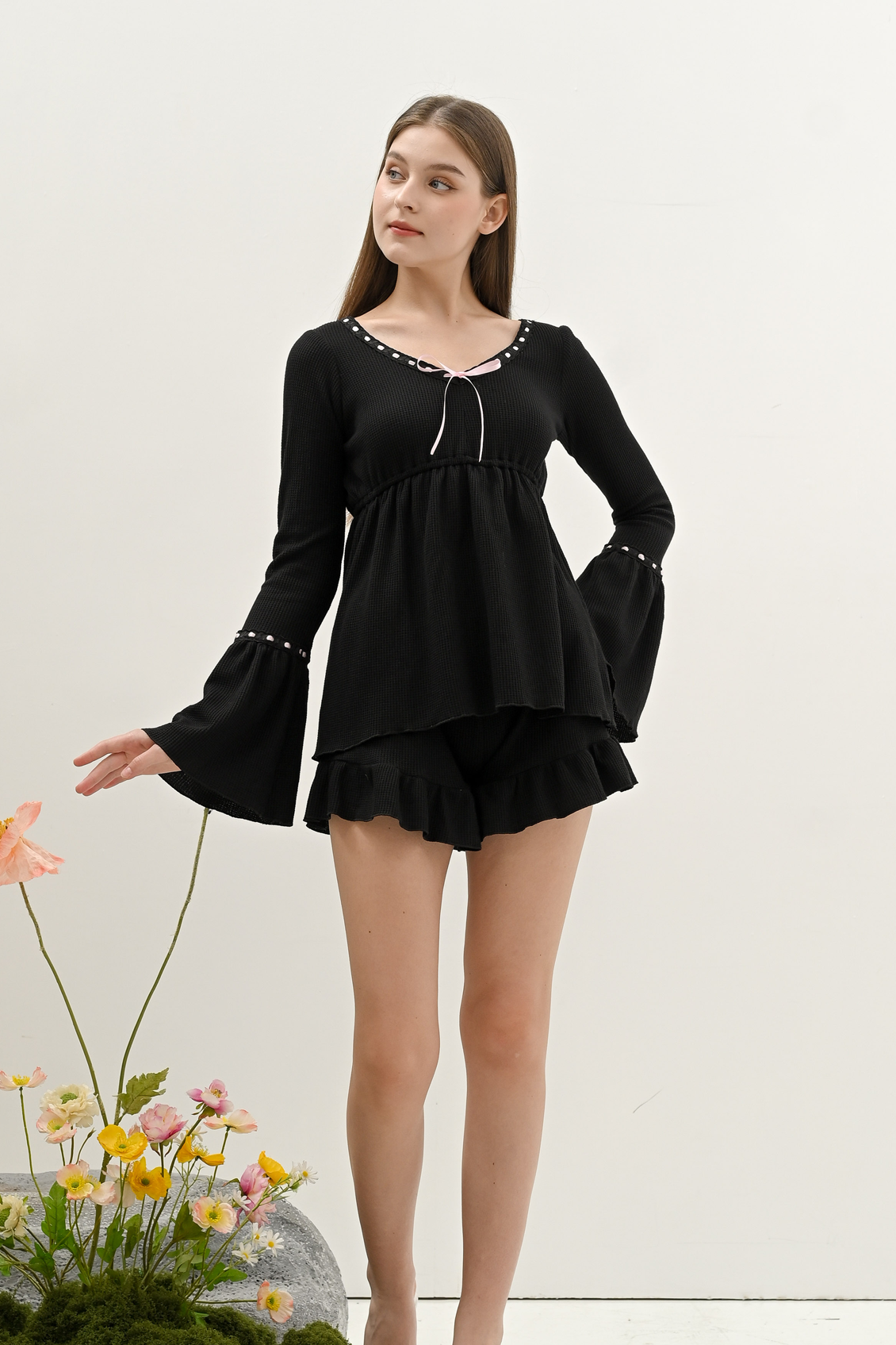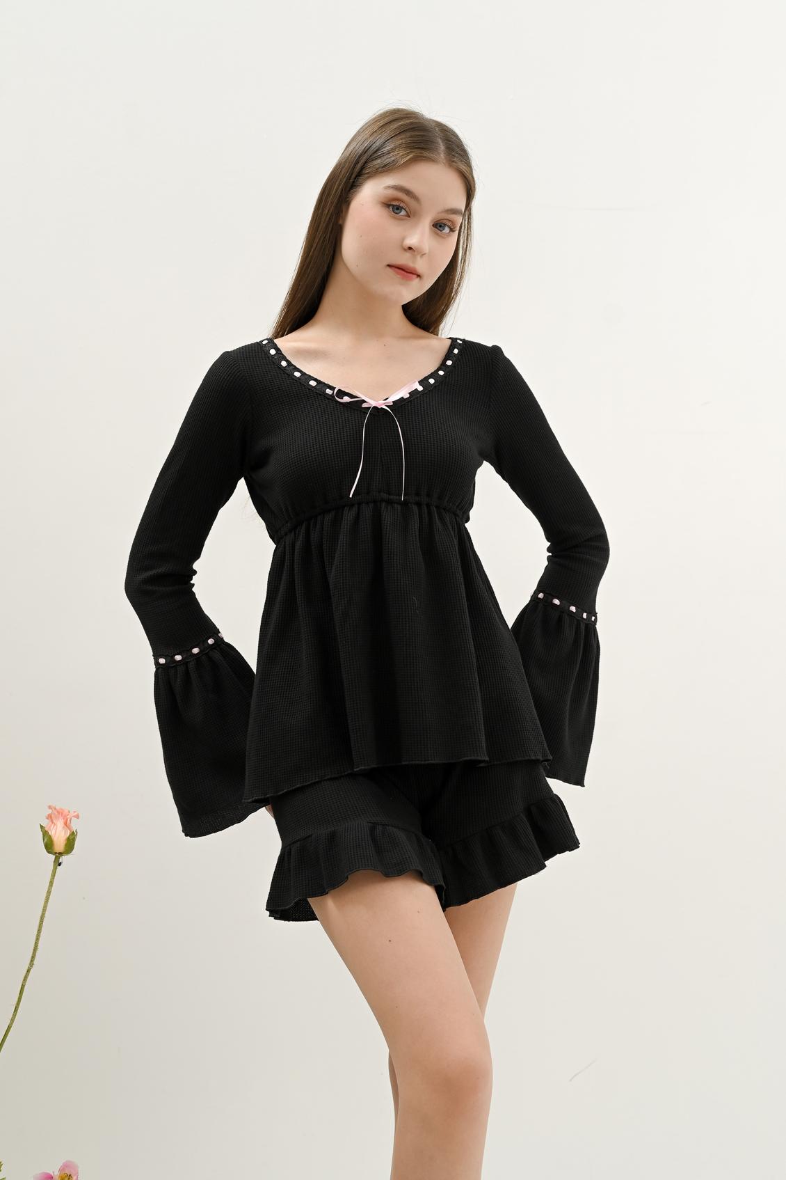 Introducing Aria, our first handmade cozy set. Featuring long bell sleeves, babydoll silhouette, and 100% cotton waffle fabric, it's perfect to lounge in. The shorts are highwaisted with elasticised waist. Top and shorts are sold separately.