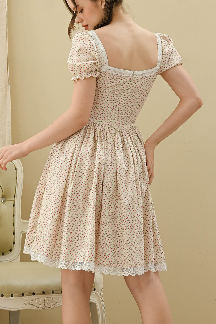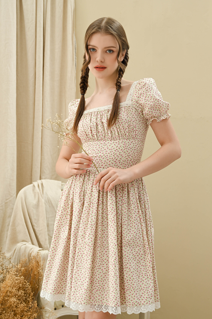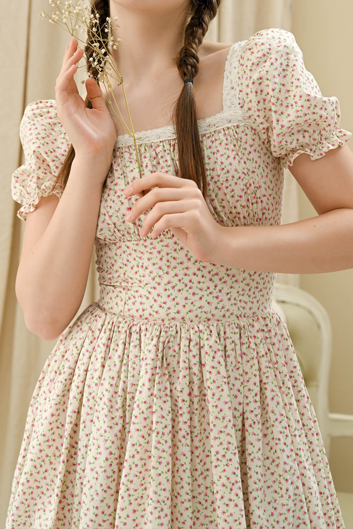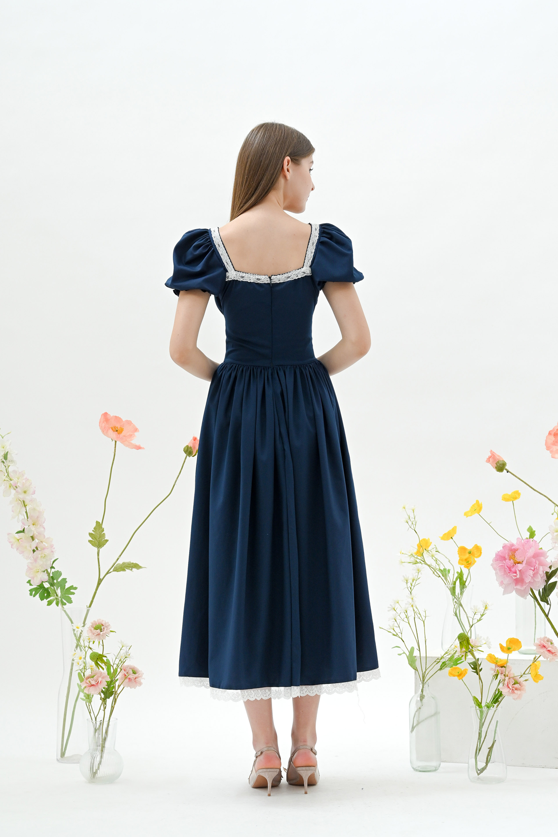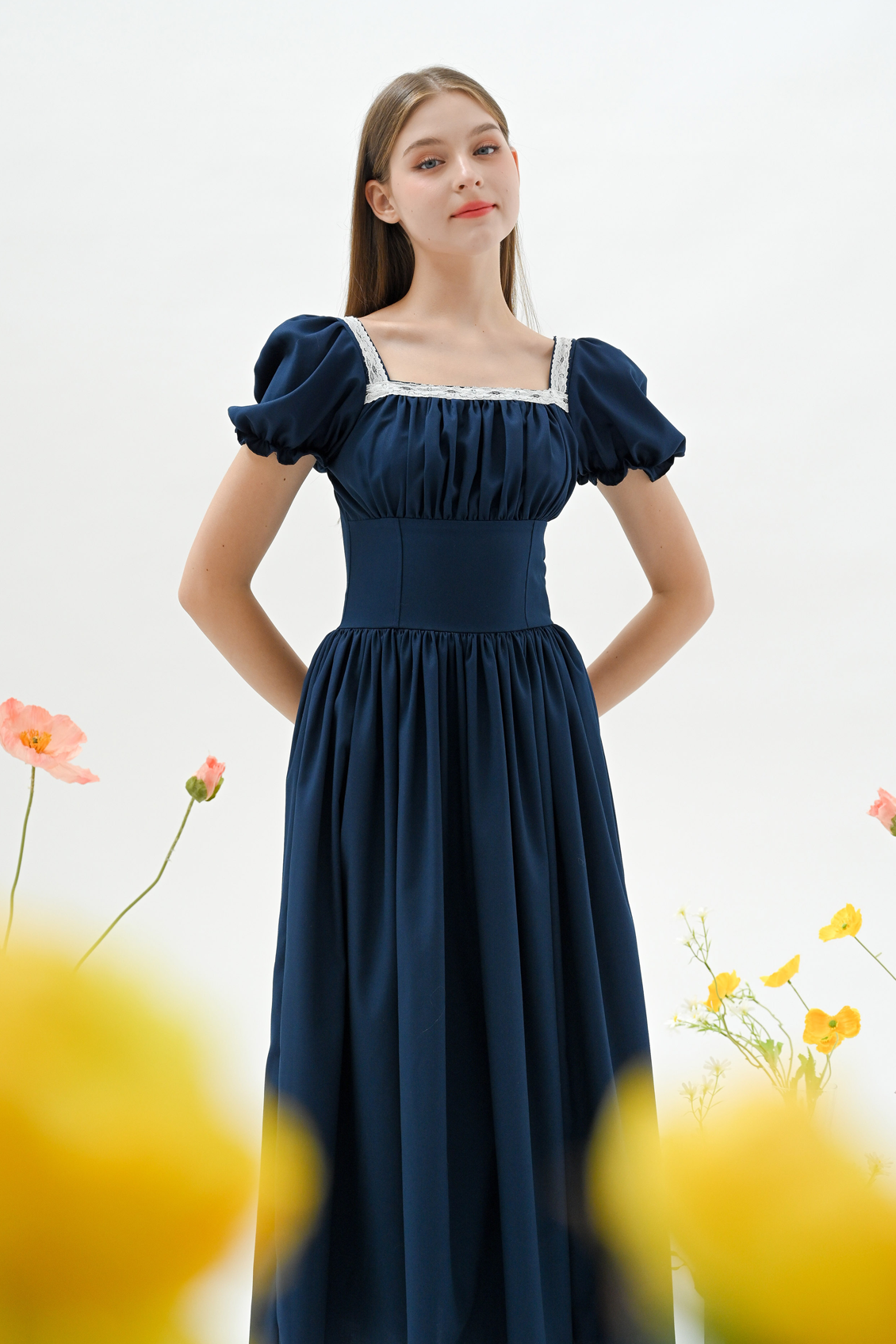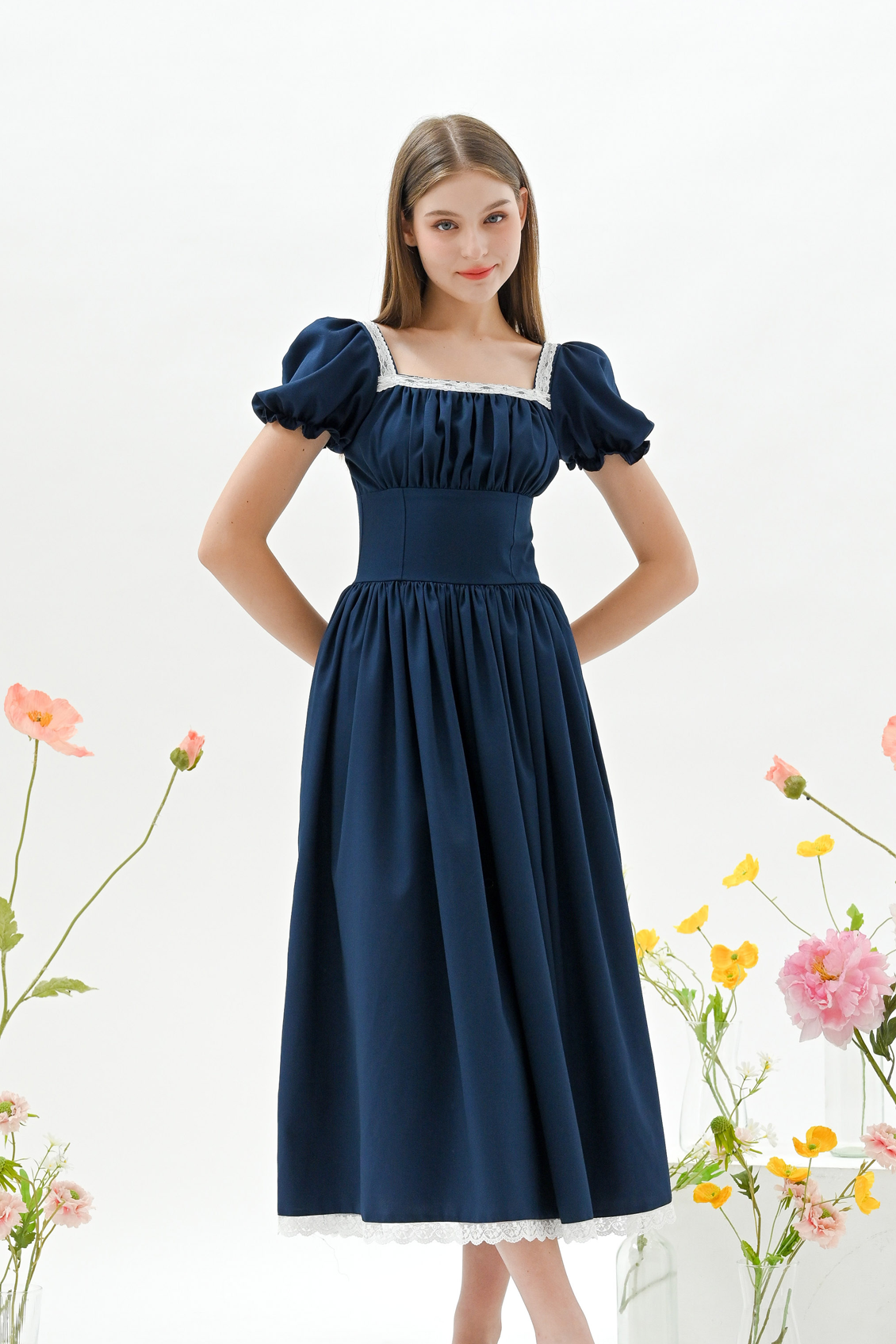The Celeste Dress is a timeless, dreamy dress with a square neckline and short puffed peasant sleeve. Made from satin with lace trim.