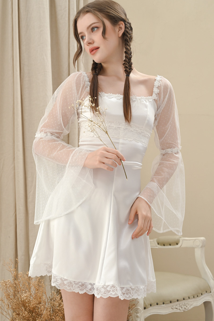 The Lana dress is a satin mini dress featuring a square neckline and bell sleeves. Tulle sleeves with embroidered floral lace. This style is not lined, with an invisible zipper at the back.