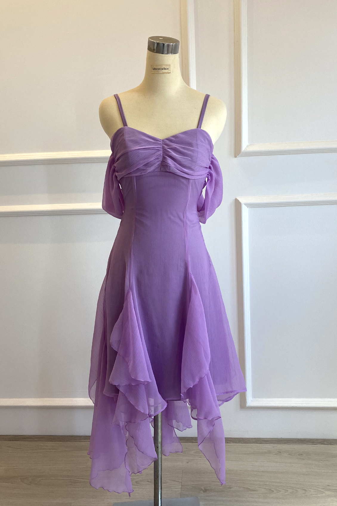 Sweetheart neckline, drop sleeves, cascading ruffles.
